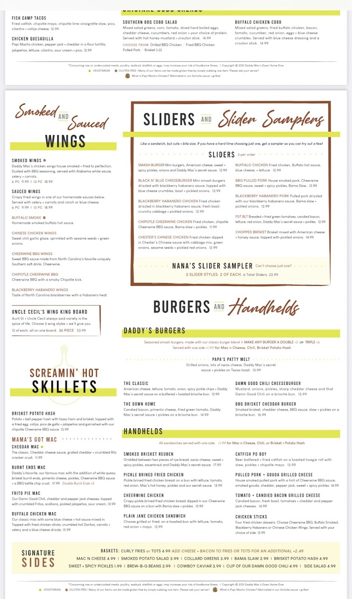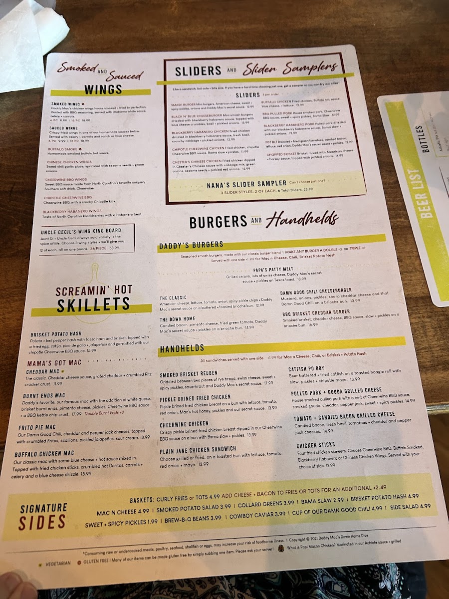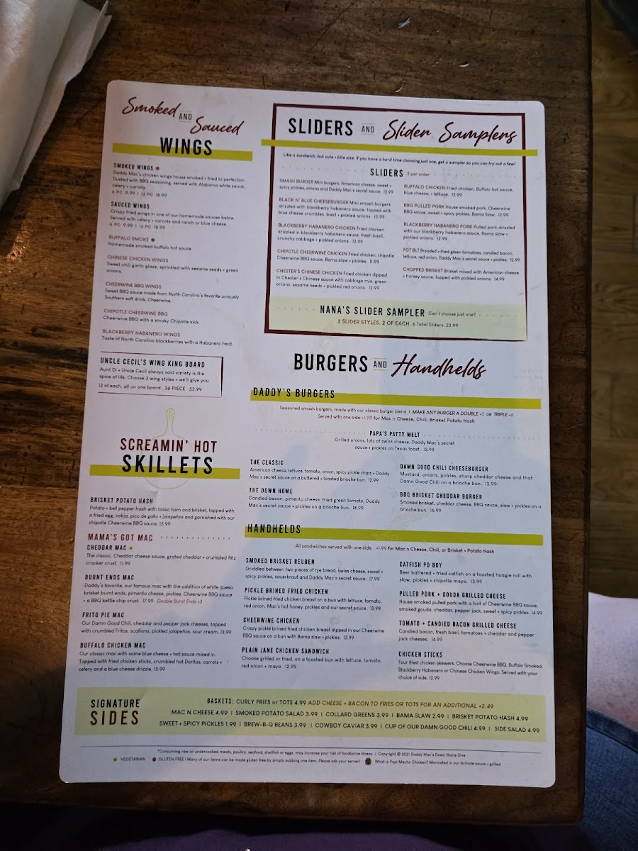 “ We settled on dinner at Daddy Mac’s Down Home Dive based on the recommendations of a hotel staff member during a vacation to Asheville, and it turned out to be one of the biggest surprises of the entire trip. This is not your typical sports pub. The atmosphere is there, and the staff are very friendly, offering prompt and attentive service, but that’s where the similarities to other sports pubs ends, because what makes Daddy Mac’s stand above the rest is the cuisine. Their menu creates a fusion of traditional pub food and Carolina BBQ, and spins that marriage on its head. The food was so good during our first visit that we went back the very next night, foregoing plans to another white tablecloth establishment. The wings and sauces are better than any run of the mill chicken wing joint. Large, juicy, not over or undercooked, and the Chinese Chicken and Cheerwine sauces are the standouts. The smash burger sliders are also perfectly cooked, and would stand up to any slider or smash burger out there, and amazingly might be the least good thing on the menu. The namesake dish, mac and cheese, specifically the burnt ends mac with pimento cheese, is a must. Despite all of those highlights, and regardless of your typical pub food choices, if you eat pork, you must sample the pulled pork and gouda grilled cheese. Head and shoulders the best thing on the menu, and the thing we will order upon every visit. Yes the food is heavy, and yes the food can be greasy, but in all the best ways possible. You will leave full and happy. ”